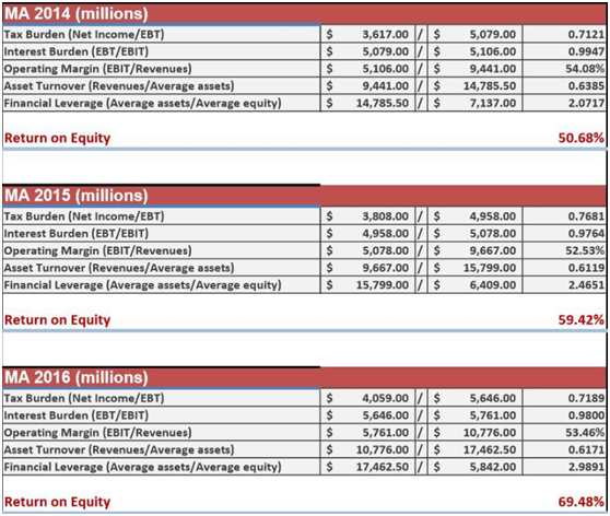 以万事达为例,通过杜邦分析法,得出公司的资本回报率,可以看到,公司的ROE从14年的50%,到16年已经快要接近70%。但是,公司由于近两年的法律诉讼,造成了15年和16年的财务费用上升,拖累了税前利润,而这项费用在14年是没有的,因此可以定义为“非经常性”;同样的,公司近两年净资产下降,增加了公司运营的杠杆效应,也会造成对ROE的放大。