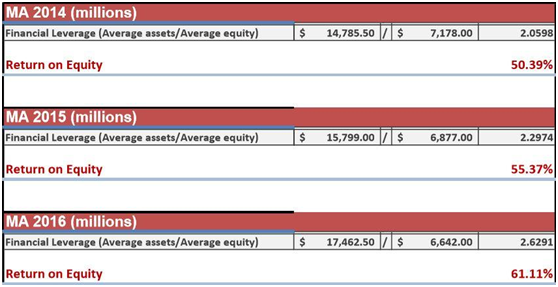 通过排除这些干扰因素,可以得到更为基础客观的ROE,由下表可知,公司的ROE在一定程度上相比上表有所下降,但是增长依然保持强劲,万事达公司2016年ROE同样也保持在60%以上。