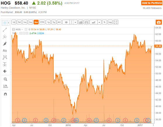 由于整体行业环境,美国摩托车2016年销量并不乐观,直接导致公司在2016年销量下滑了3.9%,达161658辆,去年同期则为168240辆;其竞争对手北极星工业(Polaris Industries,PII)销量也有一定程度的下滑,可以说,目前是摩托车行业最艰难的时期。