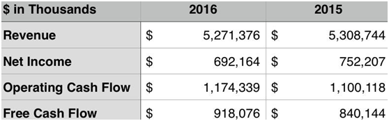 虽然,公司在2016年经营现金流和自由现金流方面同比增长较高,但是整体销售额从53.1亿下降到52.7亿美元,虽然海外销售上涨,弥补了一些损失,总体上看,公司2016年净利润依然从7.52亿下降到了6.92亿美元。