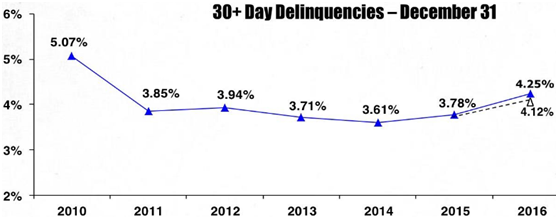 公司出现应收账款拖欠超过30天以上的频率在近两年逐渐提高,从2014年的3.61%,上升到2016年的4.25%。