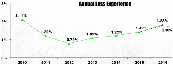 同时,公司每年应收账款坏账损失也从2012年不断增加,从当时的0.79%,上升到2016年的1.83%。