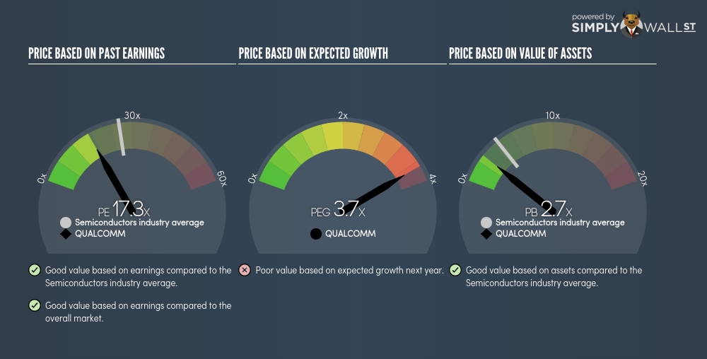 首先看下市盈率。高通当前的市盈率为17.4。YCharts显示高通近五年的平均市盈率为17.4。Gurufocus.com称高通10年期市盈率中位数为16.8。此外,当前行业的平均市盈率为23.7。对比这些数据可知,与5年期平均市盈率相比,高通当前的股价与公允价值相当,同10年期市盈率相比股价稍微偏高,与同行业市盈率相比属折价交易。
