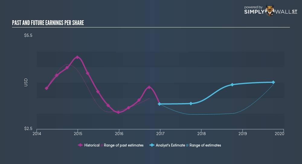 高通财报显示,2016财年公司每股收益达4.44美元,高于此前分析师的预期4.31美元。多位分析师分别给出了公司2017年及2018年的每股收益预期,2017年每股收益介于4.10美元至5.10美元,平均值为4.62美元,而2018年每股收益介于3.57美元至5.30美元,平均值为4.75美元。同2016年每股收益相比,2017年每股收益预计将增长4.1%,而2018年每股收益预计将增长2.8%。预计高通未来5年间的平均增幅为9.2%,高于公司过去5年间的增幅7.2%。此外,未来5年内行业预期增幅达11.0%,这意味着高通的增长将滞后于行业发展。