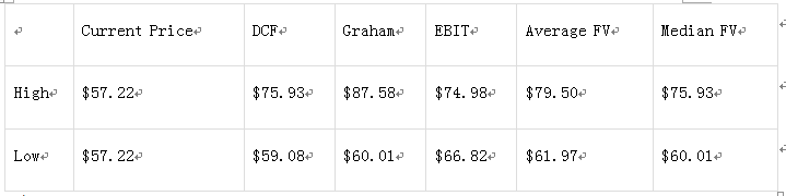 最后,使用企业价值倍数模型来计算三组情况(分别是保守估计、正常情况及极端情况)下的公允价值。营收均设为238.4亿美元,在参考高通过去五年的企业价值倍数后,上述三种情形下的企业价值倍数分别取12.8、13.4(正好等于五年间企业价值倍数的中位数)及15.4,则计算出的公允价值依次为64.39美元、66.82美元及74.98美元。