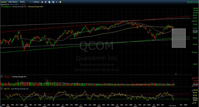 最近利空的消息在于苹果等公司可能会减少对高通芯片的使用,而采用英特尔公司(NASDAQ:INTL)最新推出的XMM7560芯片。当然了,苹果选择英特尔新芯片的前提是英特尔能按时满足苹果手机芯片的供应需求,因苹果计划在9月份推出iphone8,而英特尔预计在下半年才开始生产此款芯片,中间生产时间很短,英特尔是否能够满足苹果的大批芯片订单还是个问题。