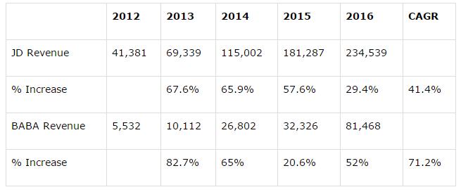 按营收计算(非平台总交易额),京东占据约9%的市场份额,排名第一,其次为阿里巴巴,两者不相上下,增速也都高的惊人。