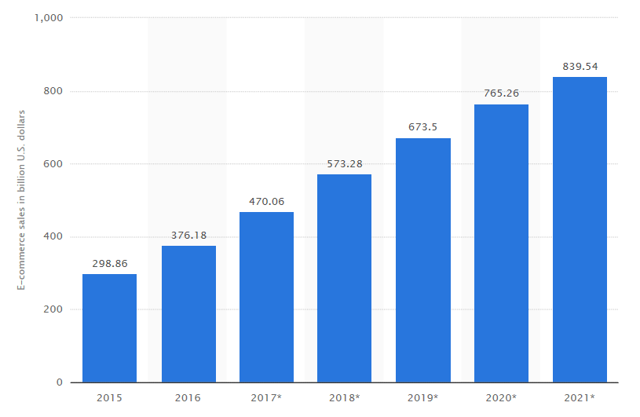 根据Statista的数据,2016年中国的电子商务市场规模为3760亿美元,2016-2020年复合增长率可达30.62%。