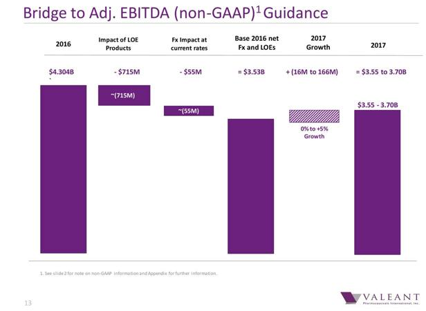 威朗2016年年报不尽人意,但其糟糕表现也是意料之中。公司营收从2015年的104.5亿美元降至2016年的96.74亿美元,同比下跌7.4%。更为重要的公司EBITDA(税息折旧及摊销前利润)则是从2015年的53.69亿美元降至43.05亿美元,同比下跌19.8%。公司对于2017年表现的预期偏低,营收和EBITDA的最低预期分别为89亿美元和35.5亿美元,这意味着威朗2017年又将面临亏损。笔者认为威朗对其2017年的预期偏低其实是个好迹象,这预示着公司CEO Joe Papa正带领威朗走向新生。笔者认为Papa是在预估专利损失药物上故意掩人耳目。威朗假设公司2017年将会损失绝大部分来自专利药品的EBITDA,即75%的EBITDA——7.15亿美元。
