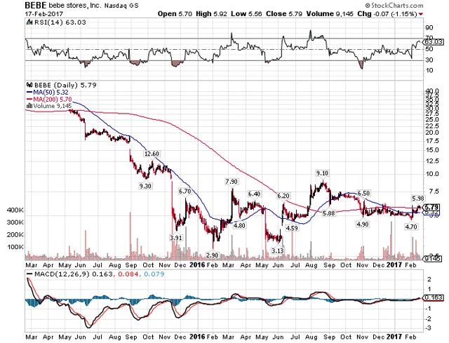 由于商场的客流量不断下降,美国女装品牌bebe stores (NASDAQ:BEBE)注定将走向没落。过去几年,BEBE的股价大幅下跌。经过最近的并股之后,BEBE的股价当前约为5美元,但是从下图可以看出,BEBE在不断走下坡路。2017财年第一季报公布之后,尽管表现不错,但笔者仍不看好它,因为市场对BEBE的需求在不断下降。此外,BEBE为了保持利润而做的举动也不太明智,最终很可能只是雪上加霜。