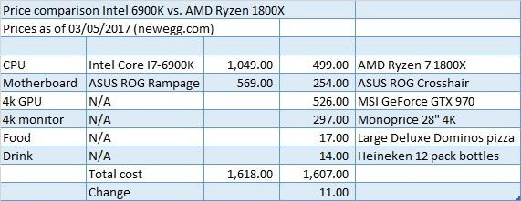 此外,如果用户要使用Intel 芯片需要花费300美元加一块X99母板,这也是一笔不小的花销。下图是Intel i7 6900K的花费换做AMD的R7,可以多买哪些东西。