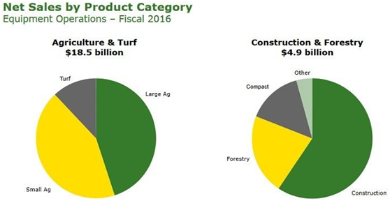 虽然长期来看,全球农业的经济状况是增长的,但是预计今年依旧不会有很大的改善。自2012年以来,农产品价格下跌,致使农民收入下降。从下图可以看出,包括棉花、大豆、小麦、玉米等农产品价格远低于12-14年水平,由此导致公司农机设备的需求减少,公司销售和净收入大幅下降。2016年,公司净销售额下降8%至266.4亿美元,特别是在美国本土和加拿大地区,销售额下降了13%;其他地区平均下降了3%,而且这一状况预计在2017年不会有明显的改善。