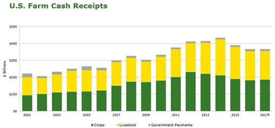 由于全球农业发展面临压力,公司经营现金流在13年和14年都超过40亿美元,但从那时起逐年下降,预计17年经营现金流将下降至26亿美元。