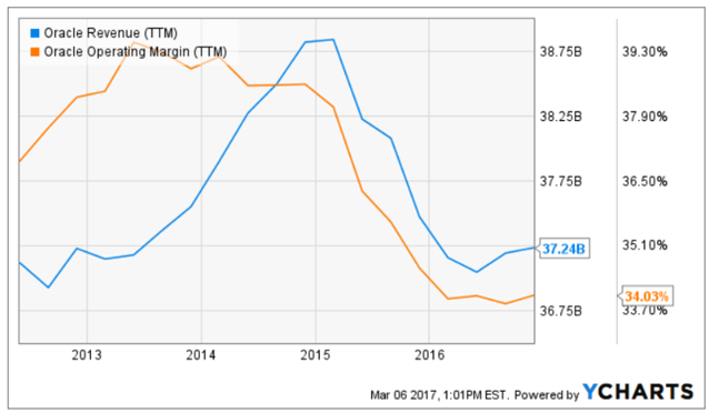 下图是甲骨文过去五年中的历史营收及运营利润数据,请注意公司2016年下半年的营收和利润最低点。