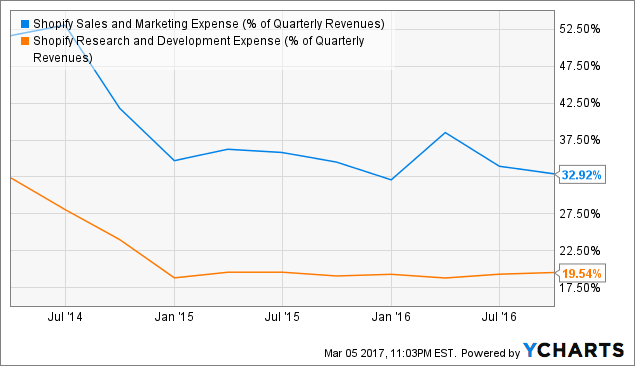 尽管Shopify花在云平台上的投入仍然很高,但是公司已经在一定程度上享受到规模经济的好处了。销售费用和研发投入都呈下降趋势: