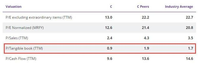 就账面价值而言,相较其它同行和行业平均水平,花旗的估值严重偏低。