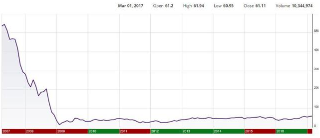 自2008年金融危机以来,花旗股价一蹶不振。从上图可知,花旗股价上行空间巨大。笔者认为花旗是大型银行中最具上涨潜力的,因此值得买入。