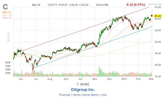 美联储三月加息预期升温。继特朗普近日演讲之后,美国加息概率一路飙升。目前大部分投资者认为美联储将会在三月进行加息。此外,预期今年还将进行两至三次加息的概率也急速上升。这无疑将极大地利好银行业。投资者当前的困境并非是否买入银行股,而是要买哪家银行。投资银行股,当然选花旗,理由如下。