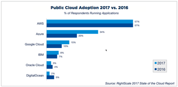 报告收集了1000个IT专业人士对2016,2017年使用云服务情况的看法,数据显示,AWS仍然牢牢占据行业第一的地位,但用户数基本持平,而Azure一年间用户数从20%提高到了34%。