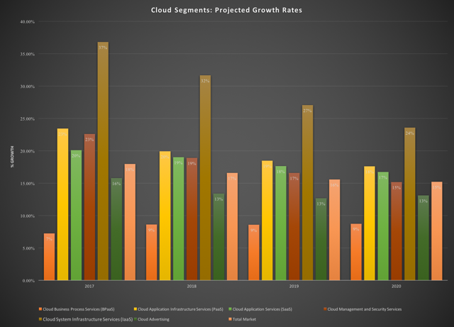 很多人担心随着行业逐渐饱和,IaaS和PaaS增速将放缓,这的确是事实,但增速远没有担心地那么低。IDC 预计2016-2020年,IaaS的年复合增速为27%, Gartner则更乐观,预计CAGR在29%左右。25%-30%的年复合增速并不低。