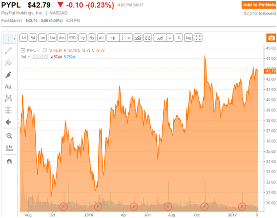 PayPal(PYPL)是倍受亿万用户追捧的国际贸易支付工具,其创始人是传奇的埃隆马斯克。在公司分拆,2015年7月二次IPO以来,公司累计上涨了20%,跑赢了大盘。尽管公司市盈率较高,但是凭借良好的现金流,公司在未来几年有望脱颖而出。