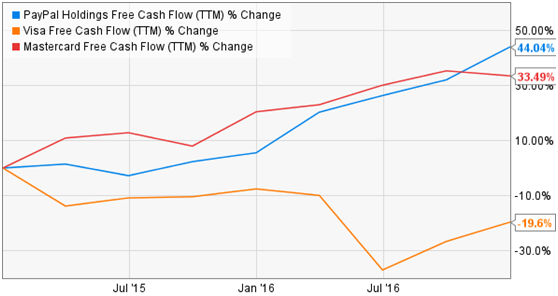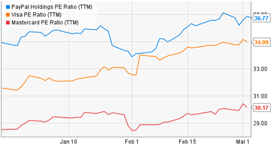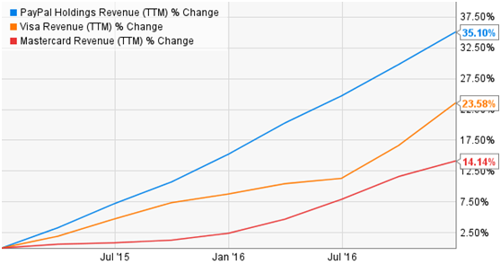 通过下图,可以看出,维萨(VISA, V)和万事达(MasterCard, MA)的收入增长是明显落后于PayPal的。在近两年的时间里,公司收入增长了35%,而维萨和万事达则分别增长了24%和14%。