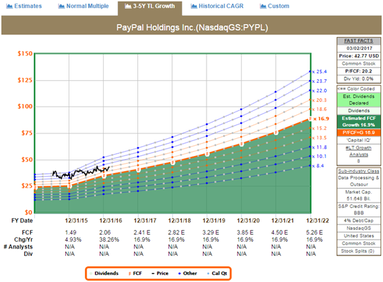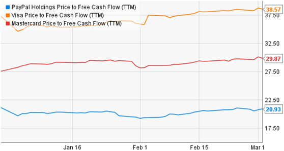 但是公司的估值优势为市现率大大低于其他两家公司,公司常年市现率保持在20倍左右,而维萨和万事达分别为39倍和30倍。由于自由现金流通常比盈利更加难以预测,因此,PayPal公司的整体估值仍然具有优势。
