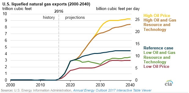 通过以上图表,EIA分析了原油价格将会怎样影响液化天然气的价格走向。一方面来看,若油价走高将会导致市场对更便宜的液化天然气的需求增大,这将进一步促使液化天然气的价格上涨,出口增加。从另一方面来看,假设石油在未来相当长的一段时间内走低,这意味着市场对价格更便宜的液化天然气的需求也不会太紧迫,因此它的出口增速也将低于预期。但是,据EIA分析,即使油价低位徘徊,液化天然气的出口也将缓慢上涨。EIA认为,在油价走高的情形之下,液化天然气的出口量将达到9.2万亿(tcf)立方英尺或250亿立方英尺/天。此外,特朗普的能源基建计划也将继续提振天然气出口。综上,笔者认为未来天然气价格将会走高。若天然气价格一旦走高,CHK也将从此获得可观的利润,因为它的主营业务就是天然气。
