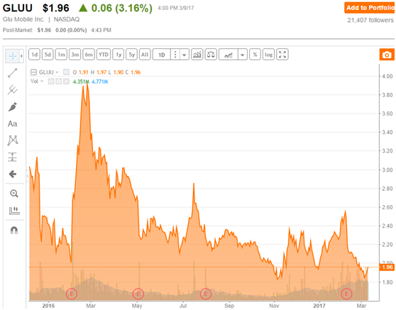 Glu Mobile(GLUU)是全球排名前三的移动终端游戏开发公司和游戏发行商,在2015年与我国互联网巨头腾讯达成战略合作协议,而且腾讯以1.26亿美元入股Glu Mobile。
