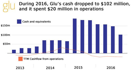 与此同时,公司必须谨慎使用现金储备。截至2016年年底,公司现金及等价物为1.02亿美元。2017年必须支付2600万美元已签署的许可证费用,其次,公司还要支付540万美元之前的重组费用,270万整合Crowd Star,高达420百万的Crowd Star员工工资和每年3000万美元运营费用,包括530万美元新的大型工作室的固定资产花费。