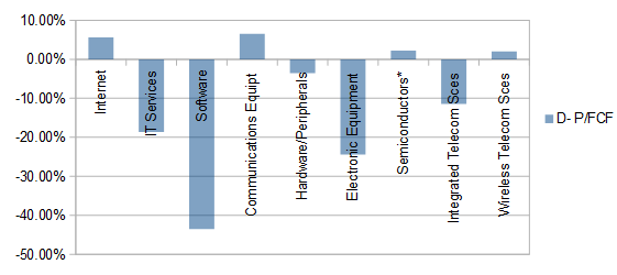 自由现金流比例(P/FCF)上,互联网,电子设备,半导体,电信提升,其他板块稳定;
