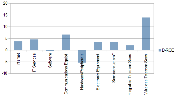ROE上,互联网,软件,硬件,综合电信服务下降;