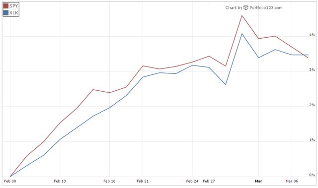 最后是过去一个月科技行业ETF与标普500指数的表现对比: