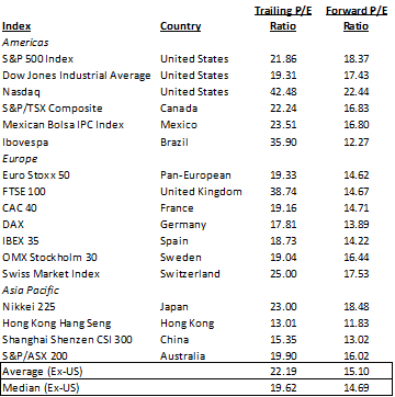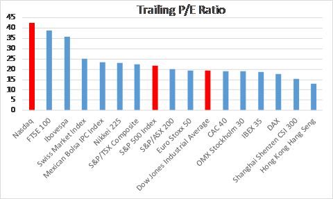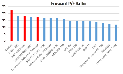 美国股市的估值看起来跟加拿大的差不多,比欧洲股市略高,可能是由于美国利率普遍偏低,虽然欧洲利率更低,但是经济前景不景气拖累了估值。日本的情况则是人口结构问题,利率也仅有0.08%,估值略高。