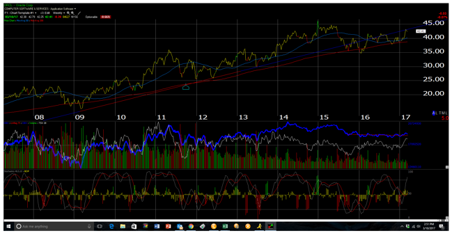 上图为甲骨文2014年12月创下股价新高46.71美元以后两年半以来的周线图。无独有偶,公司股价创下的新高时也是2000年9月的高点。显然,当交易量大于股价高点的交易量时,一旦股价超过46美元,长线就可能上涨。