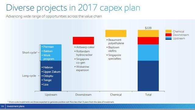 上图显示了埃克森美孚对2017年的具体规划。从图中可以看出,它的上游项目分为两部分:短期和长期项目。长期项目往往需耗时多年,当前埃克森美孚在以下长期项目已投入至少几年的时间了:包括加拿大东部的Hebron项目、阿联酋的Upper Zakum扩建项目和俄罗斯远东的Odoptu项目、哈萨克斯坦的Tengiz扩建项目。