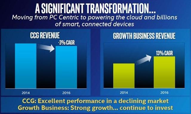 Intel的新成长中心包括数据中心,IoT,分别增长8%和15%。问题还是Intel的核心PC业务仍然占到全部营收的一半以上,而该部分去年的增长仅有2%。相反,数据中心和物联网加起来占到全部营收的三分之一,Intel必须努力提高这部分的占比。