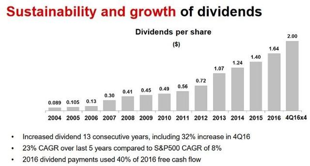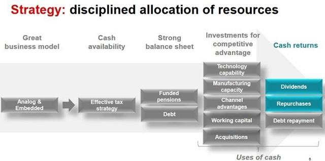 Intel很少提高分红,目前的股息率在2.9%左右。相反,TI连续13年提高了分红,去年的分红增长是32%,过去5年分红派现的年复合增长率在23%左右。