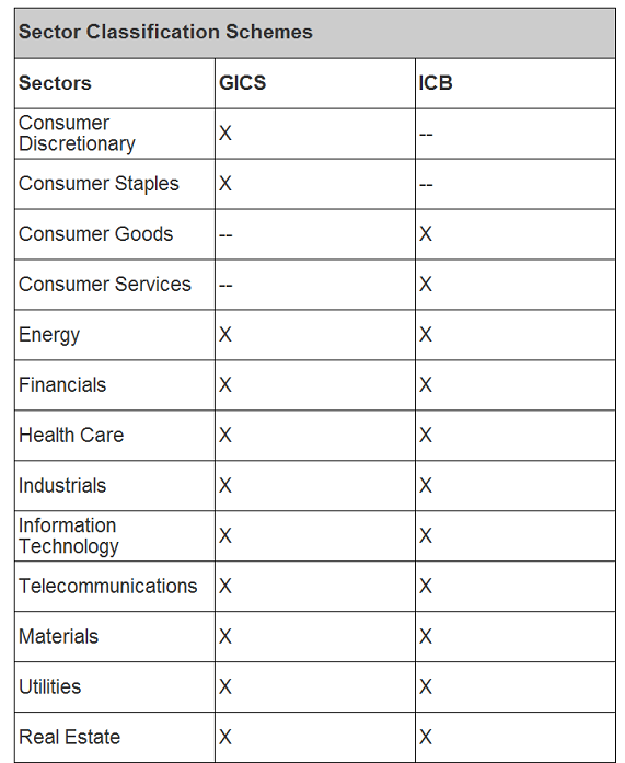 当前有两大分类方案:全球行业分类标准(GICS)和行业分类基准(ICB)。GICS由摩根士丹利资本国际(MSCI)和标普在1999年提出。截至2016年9月,GICS为四级分类,包括11个行业部门、24个行业组、68个行业和157个子行业。另一种分类标准ICB由道琼斯和FTSE联合提出。ICB包含10个一级行业,19个超行业部门,41个基本行业部门和114个子行业部门。总体来说,两个行业分类结构非常相似,差别并不大。下图展示了每种分类方案的具体行业构成。