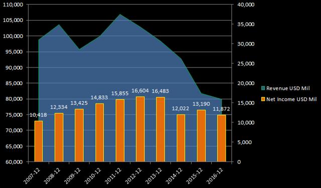 最令投资者担忧的无非是公司的营收和净利润了。公司营收2012年达到1069.2亿美元,之后几年便逐年下滑,净利润也因此持续缩水。下图列出了2012年至最近财年公司营收的变化。