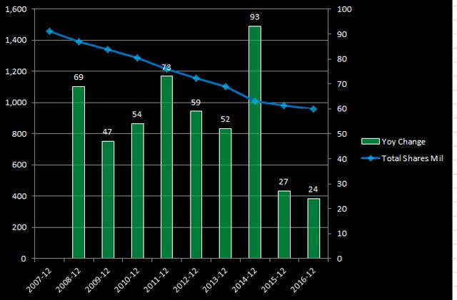 从上图看,得益于公司的股份回购,过去十年间流通股总数急剧下降。自2007年底,通过股份回购,公司流通股减少了5亿股,相当于流通股股份减少了34%。