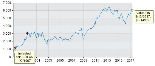 长期来看,了解IBM过去表现的人都知道,公司不仅可以挺过极端的市场环境,还可以同时保证稳定的派息。如图,如果你在1997年1月初投入919.5美元买入公司股票,那么你就能在20年之后,准确来说,在2017年3月13日就能收获约61.4万美元。