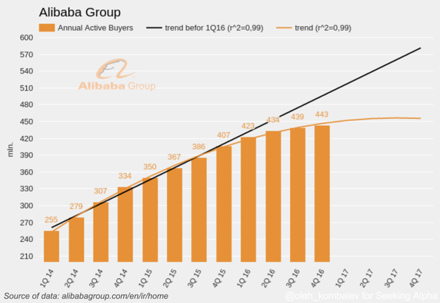 直至2015年第四季度,阿里巴巴的年活跃用户增速呈线性上涨趋势。但是自此之后,新用户增速开始放缓。到2017年底,阿里巴巴的年活跃用户数量将很可能停滞在4.55亿人次的水平。