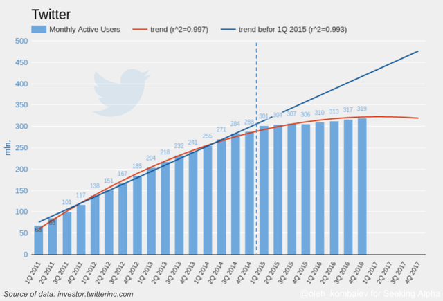 直至2014年底,Twitter (NASDAQ: TWTR)的活跃用户数量一直在稳步上涨。但自此之后增速开始呈放缓趋势,最终在达到3.2亿人次的水平之后,用户增速停滞不前。