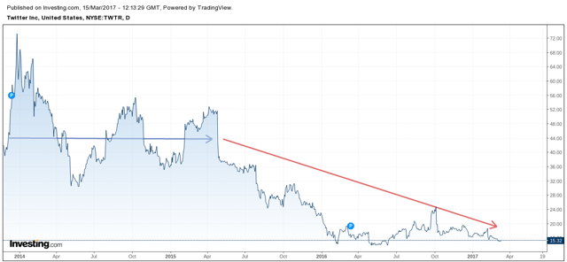 与此同时,Twitter的股价变化也基本与之同步。2015年之前股价在高位徘徊,之后便大幅下跌,请看下图: