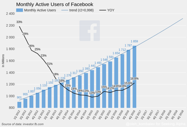 2012年之后,脸谱(NASDAQ:FB)的月活用户增速一直在稳步增长,请看下图: