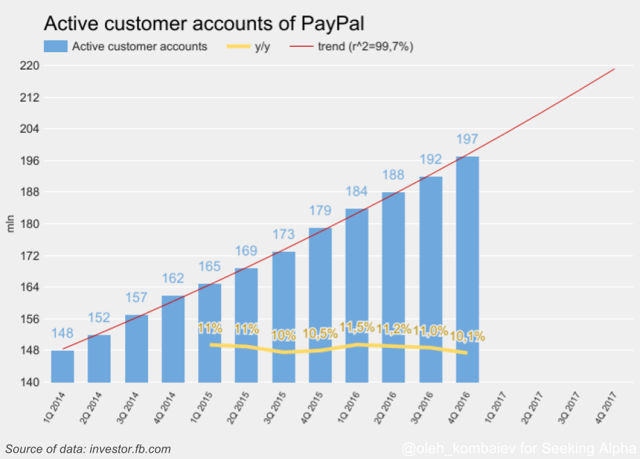 此外,2014年以来,Pal (NASDAQ:PYPL)的活跃账户每年平均以10.5%的速度增长,请看下图: