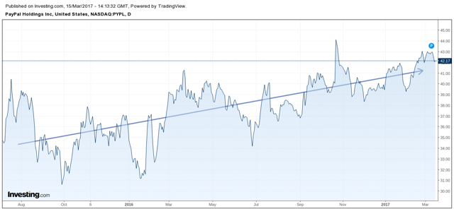 在此期间,PayPal的股价也一直呈上涨趋势,请看下图: