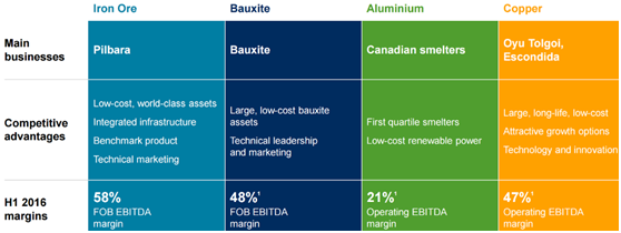 公司拥有世界级的资产,在铁矿业务方面,主要集中在澳大利亚,而且成本低、质地高,毛利率达到58%;而且公司铝土矿和铝矿资源丰厚,分别拥有48%和21%的毛利率;随着铜价的回升,公司铜矿石业务利润也会相应增长。公司拥有世界级的资产分布,而且多数为品质高、成本低,利润率较高。