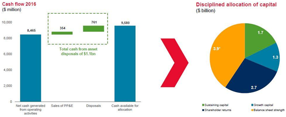 自由现金流的增长使得净债务从2015年的138亿美元进一步下降,到2016年中期为129亿美元,而在年底则下降到96亿美元。